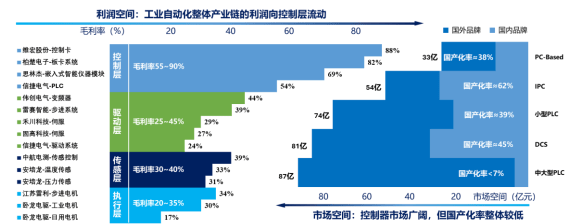 工业从动化是指将从动化手艺使用于工业制制的各个环节,实现出产效率和质量的显著提拔,成为提拔出产力的主要手段。工业从动化手艺的成长依赖于消息手艺、计较机手艺和通信手艺的深度融合,并极大地改变了保守的出产功课模式,加快了工业手艺的现代化转型。工业从动化现已普遍使用于工业企业的出产、节制和办理环节,还正在很大程度上削减了出产过程对人工操做的依赖,为工业企业带来了更高的产能、更好的产质量量,以及更不变的出产过程。工业从动化设备是工业从动化行业的主要构成部门,次要通过电子电气、机械和软件系统的协同工做,实现工场出产和制制的全面从动化、切确化和高效化。工业从动化设备产物品种繁多,按功能可分为节制层、驱动层、施行层取传感层,通过系统集成构成整套节制系统产物。节制层(包罗PLC、PC-based等)通过采集传感层设备的信号,通过法式计较后构成节制参数,向驱动层发出节制指令,驱动层(伺服驱动器、变频器等)按照指令驱动施行层(电机、阀门等)施行相关动做,传感层(包罗传感器、编码器、机械视觉等)次要担任、丈量、反馈表里部消息并传输相关信号,节制层监测传感器传输的反馈信号并及时调整指令,节制系统可以或许准确运转。全球工业从动化起步于20世纪40-60年代,并正在20世纪80年代后进入了快速成长阶段。成长至今,市场规模不竭增加,合作也更加激烈,颠末优胜劣汰,构成了以西门子、ABB、三菱等欧美取日系品牌为代表的跨国巨头从导全球工业从动化市场的款式。21世纪以来,工业从动化做为智能制制的主要根本,遭到世界普遍关心,美国、等世界工业强国均把成长智能制制财产做为沉点成长标的目的,提出了“工业4。0”等一系列计谋规划。我国工业从动化起步较晚且缺乏焦点手艺堆集,持久以来,以西门子为代表的外资品牌占领第一梯队,本土品牌处于第二梯队,此中外资品牌已构成了较完整的产物线,本土品牌厂商正在品牌、手艺上取外资厂商存正在必然差距,但正在部门细分市场上曾经显示出必然的合作劣势。跟着工业从动化行业的不竭成长,为支持国内制制业转型取升级、激励工业从动化行业成长取立异,国度近几年连续出台了多项政策。《中华人平易近国国平易近经济和社会成长第十四个五年规划和2035年近景方针纲要》正在“制制业焦点合作力提拔”专栏要求沉点研制分离式节制系统、可编程逻辑节制器等工业节制配备,为工业从动化行业的成长指了然标的目的。按照中金企信数据,2023年正在宏不雅经济呈现弱苏醒的态势下,制制业对工业从动化节制行业的需求也较为疲软,导致全体从动化市场规模有所下滑,但估计正在近年恢复增加。 |